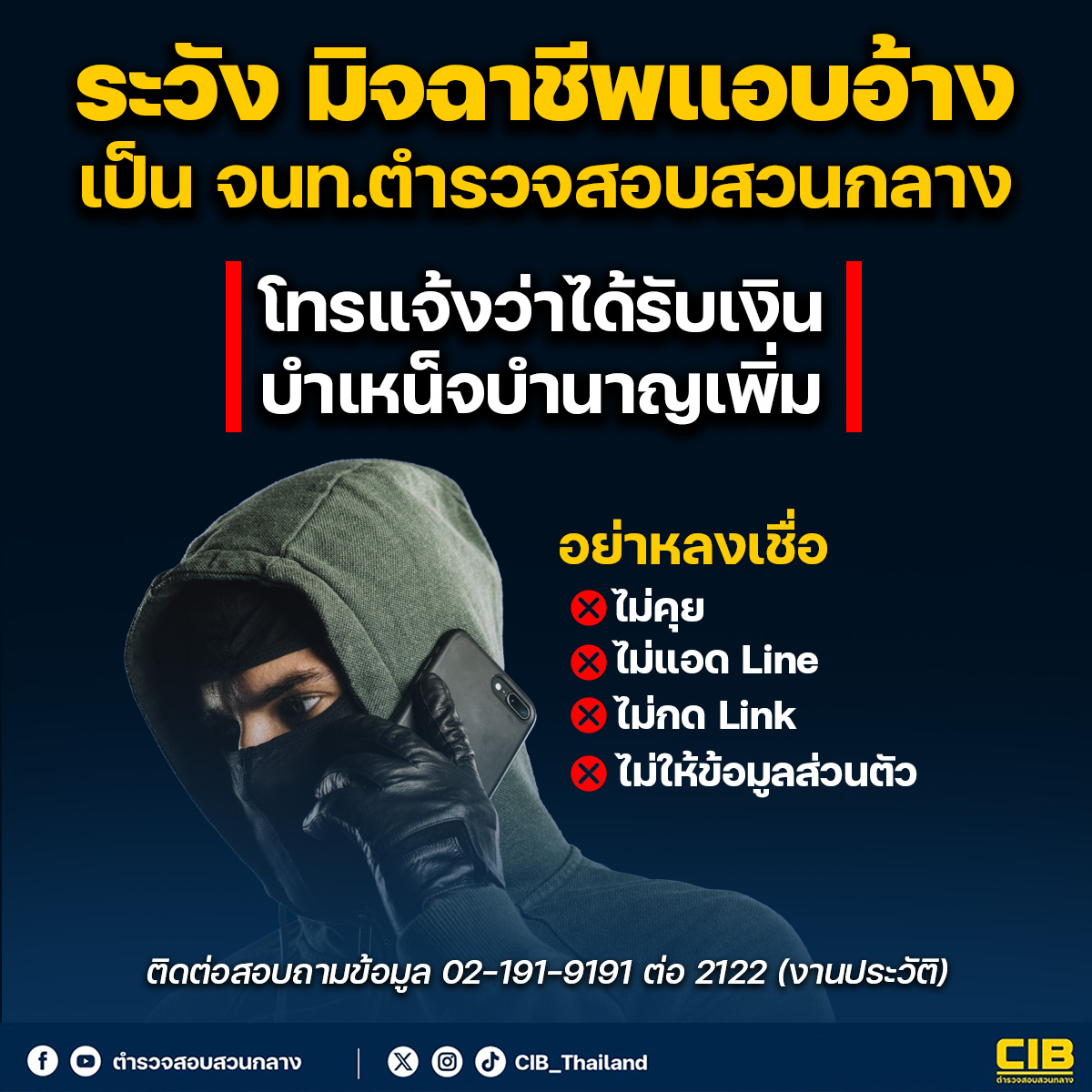 ระวัง มิจฉาชีพแอบอ้าง เป็น จนท.ตำรวจสอบสวนกลาง โทรแจ้งว่าได้รับเงิน บำเหน็จบำนาญเพิ่ม อย่าหลงเชื่อ x