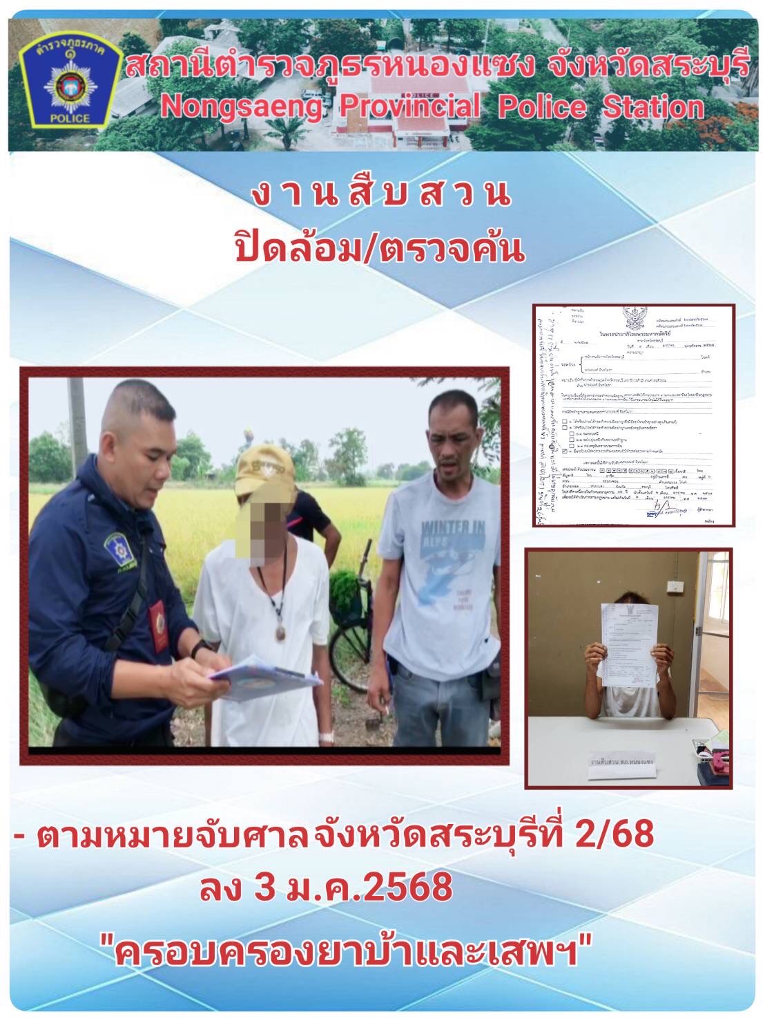 เมื่อวันที่ 28 มี.ค.2568 ได้ดำเนินการสืบสวนติดตามจับกุมผู้ต้องหาตามหมายจับศาลจังหวัดสระบุรี ที่ จ.13