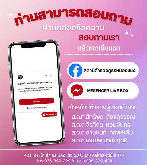 Q แจ้งเหตุด่วน เหตุร้ายA. สถานีตำรวจภูธรหนองแซง ๐๓๖-๓๙๙-๒๒๙ หรือโทร ๑๙๑