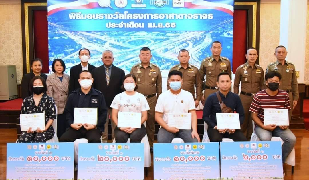 วันที่ (7 เม.ย.66) เวลา 10.00 น.ณ ห้องสารสิน สำนักงานตำรวจแห่งชาติ พล.ต.อ.ดำรงศักดิ์ กิตติประภัสร์ ผบ.ตร. , พล.ต.ท.ธนา ชูวงศ์ ผู้ช่วย ผบ.ตร. , พล.ต.ท.ประจวบ วงศ์สุข ผู้ช่วย ผบ.ตร. , พล.ต.ท.นิธิธร จินตกานนท์ ผบช.ประจำ สง.ผบ.ตร. พล.ต.ต.จิรสันต์ แก้วแสงเอก รอง ผบช.น. และ พล.ต.ต.เอกราช ลิ้มสังกาศ ผบก.ทล. พร้อมด้วย นพ.แท้จริง ศิริพานิช เลขาธิการมูลนิธิเมาไม่ขับ, คุณ พิศเพลิน วิริยะพันธุ์ ผู้ช่วยผู้จัดการฝ่ายสื่อสารองค์กรบริษัท วิริยะประกันภัย จำกัด (มหาชน) คุณนิตยา ลีธีระกุล รองผู้จัดการฝ่ายรายการ สถานีวิทยุพิทักษ์สันติราษฎร์ สวพ.91 และ คุณอัจฉรา บัวสมบูรณ์ ผู้ช่วยผู้อำนวยการ สถานีวิทยุ จส.100 ร่วมแถลงผลการมอบรางวัล และเกียรติบัตร โครงการอาสาตาจราจร โดยมอบรางวัลให้กับประชาชนเจ้าของคลิปกล้องหน้ารถที่บันทึกอุบัติเหตุทางถนนหรือการกระทำผิดกฎจราจรที่สำคัญ ประจำเดือน ม.ค. และ ก.พ. 2566 จำนวน 20 รางวัล เงินรางวัลคลิปสูงสุดคลิปละ 20,000 บาท รวมเงินรางวัลที่มอบทั้งสิ้น จำนวน 100,000 บาท โดยบริษัท วิริยะประกันภัย เป็นผู้สนับสนุนเงินรางวัล