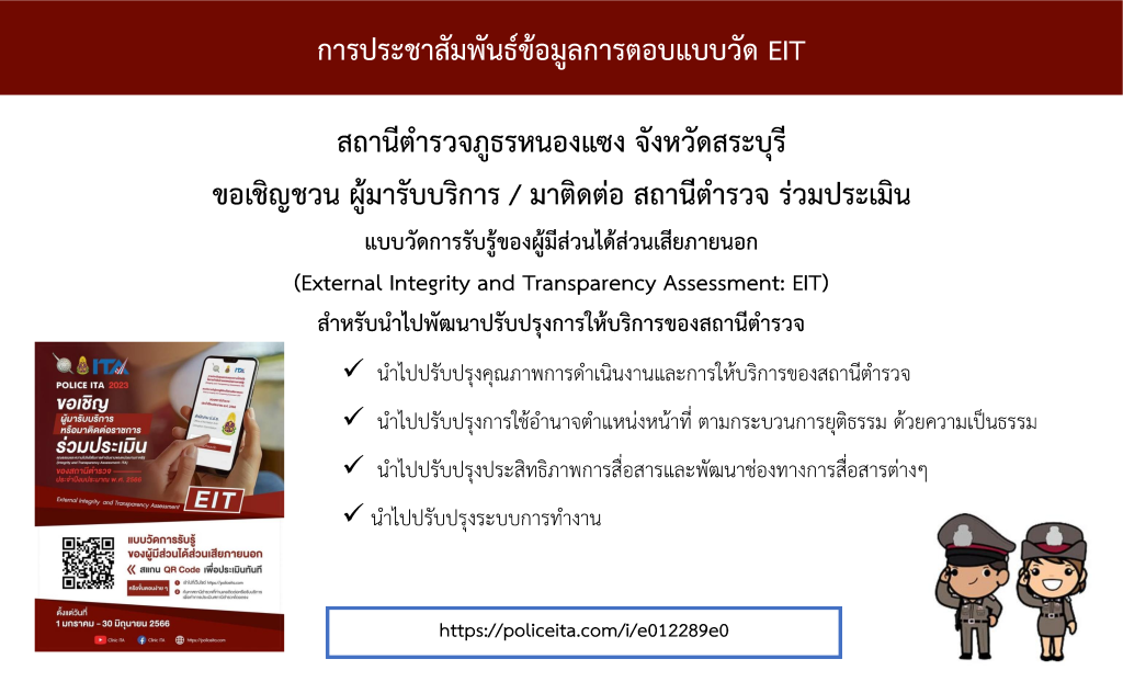 สภ.หนองแซง ขอเชิญผู้มารับบริการ หรือติดต่อราชการร่วมประเมิน คุณธรรมเเละความโปร่งใสในการดำเนินงานของหน่วยงานภาครัฐ ITA ของสถานีตำรวจประจำปีงบประมาณ 2566